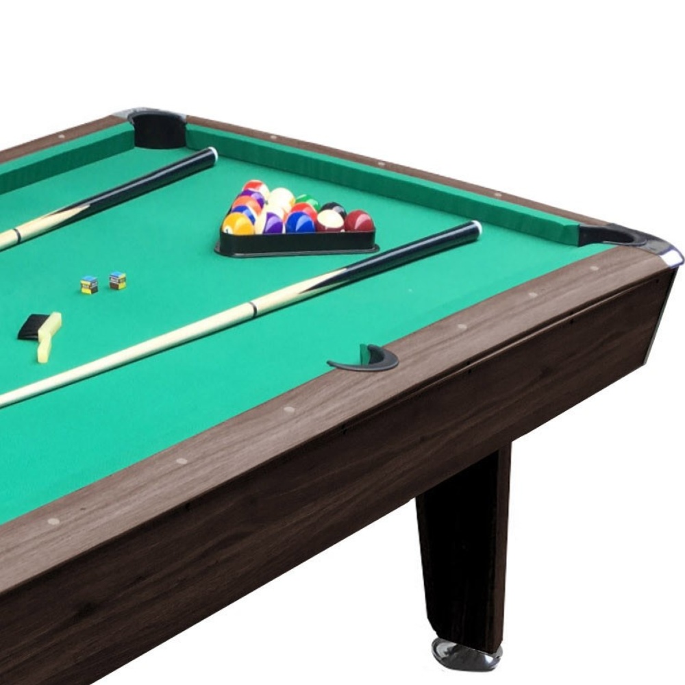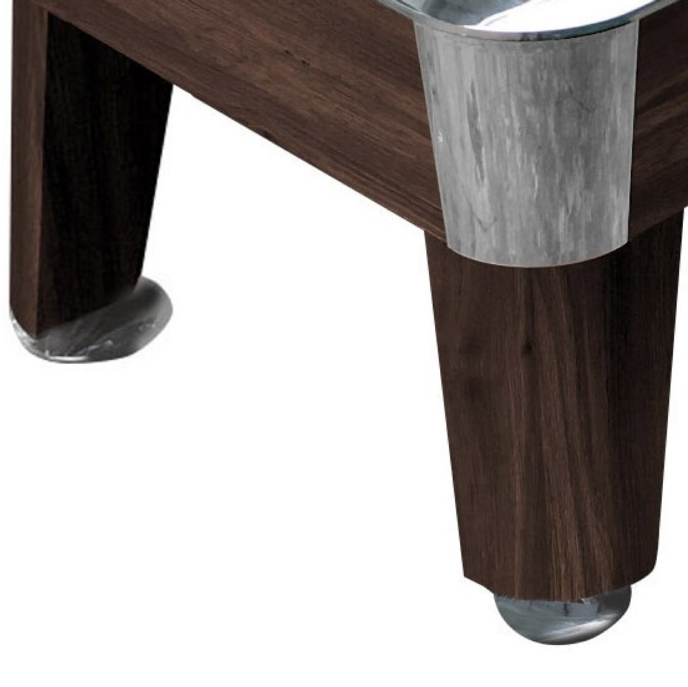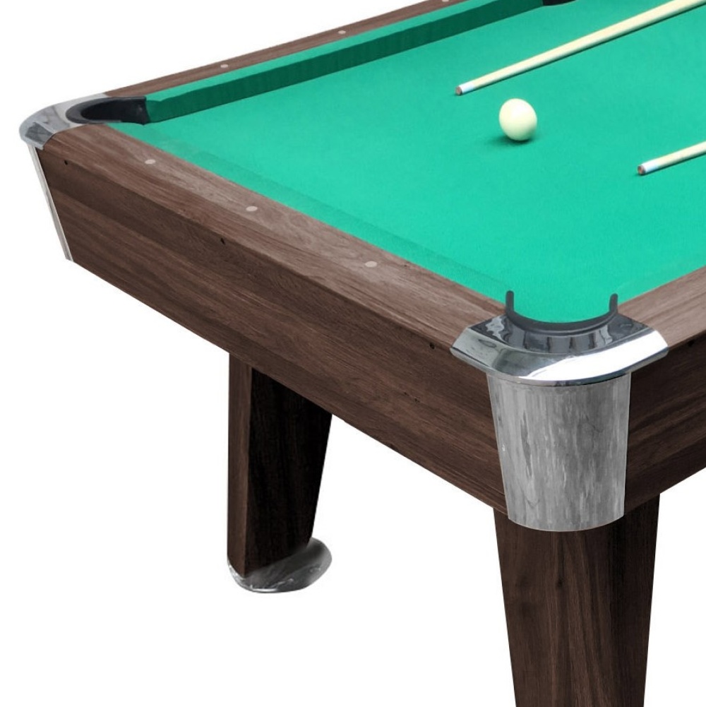 This pool table, available in two sizes, is characterized by the walnut colored furniture embellished with chromed details, with a classic look that recalls that of the models of American arcades.