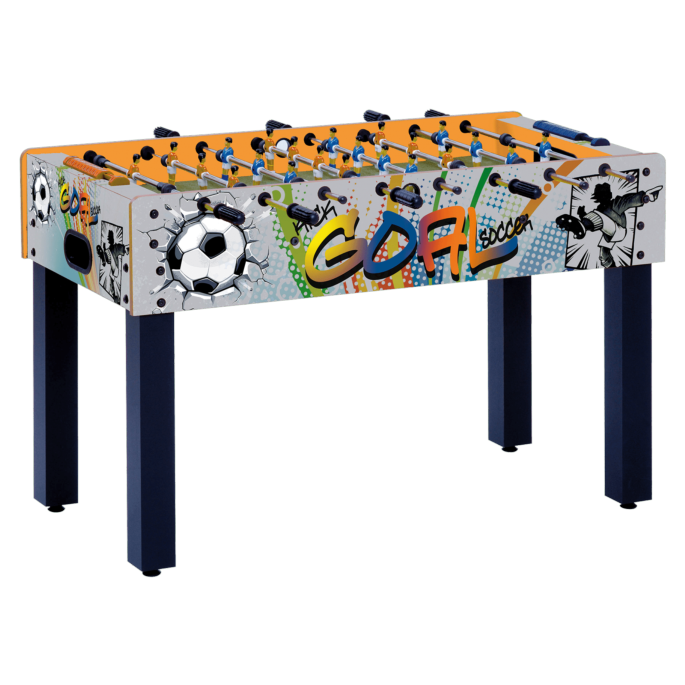 The squared cabinet ressembling the coin operated tables (whose components it mounts, including the roller bearing that allow the bars to glide very smoothly), the players in the typical red and blue and a cabinet colour perfectly fitting any setting shortly won any type of public, not only in Italy.