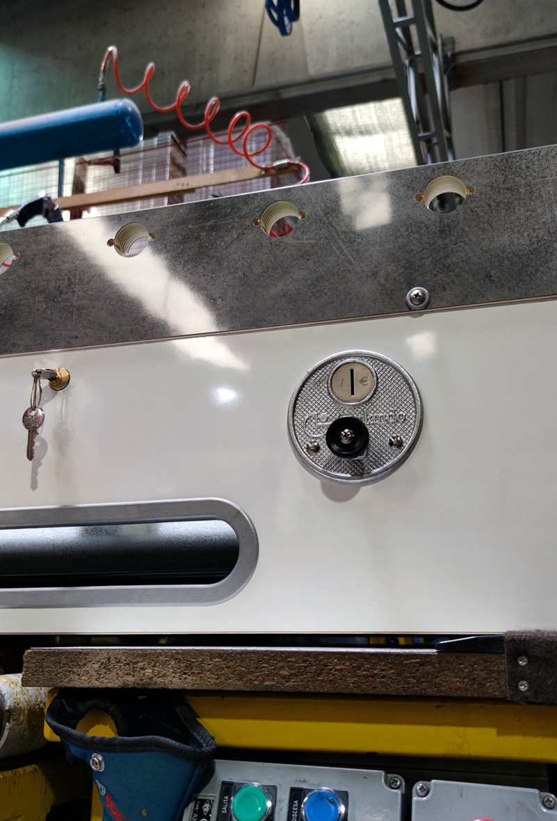The assembly of all its parts (including those in wood) is made without using any glue, to allow easy and quick replacing. The cabinet is equipped with a metal bracket supporting the upper part when this is lifted, to allow a safe operator access to the inside for easier cash recovering.