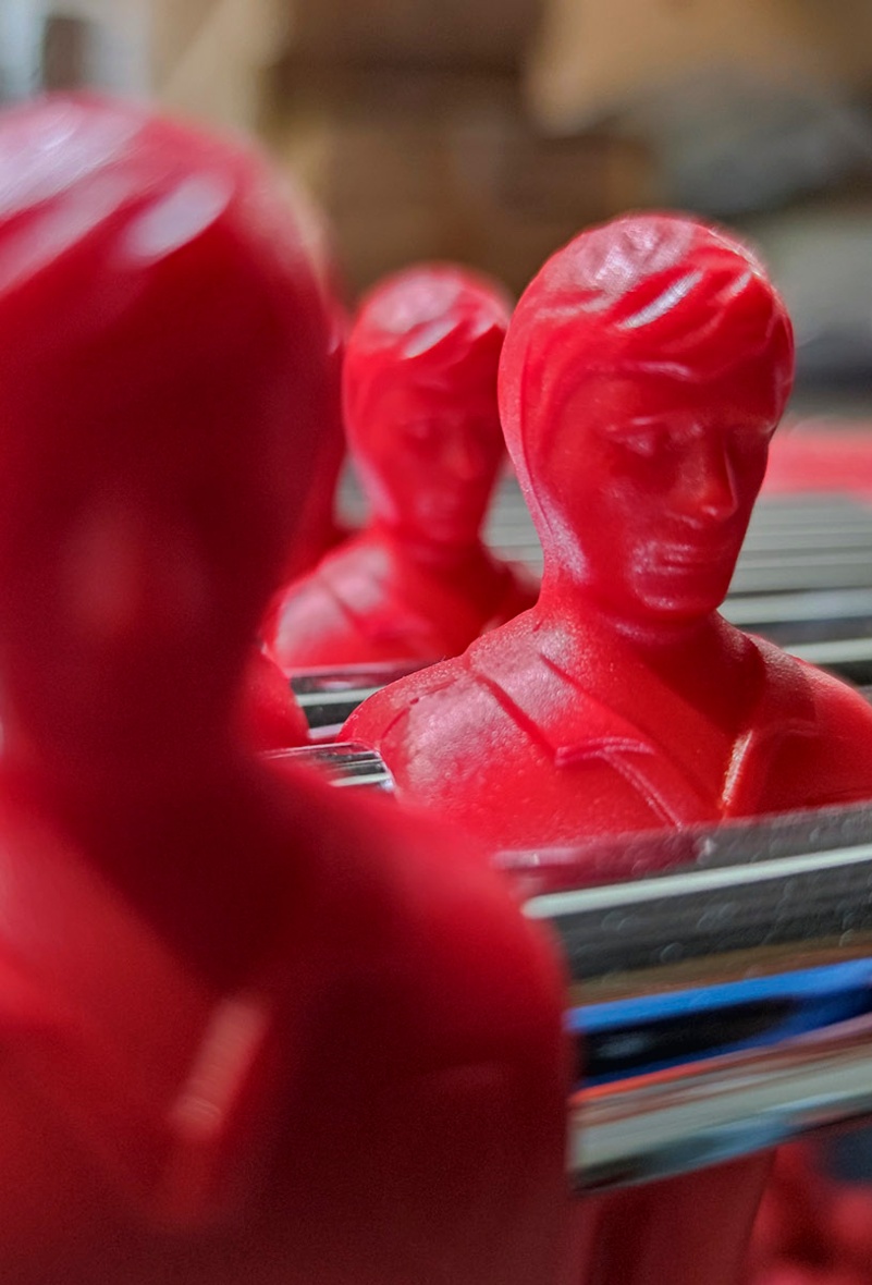 The squared cabinet ressembling the coin operated tables (whose components it mounts, including the roller bearing that allow the bars to glide very smoothly), the players in the typical red and blue and a cabinet colour perfectly fitting any setting shortly won any type of public, not only in Italy.