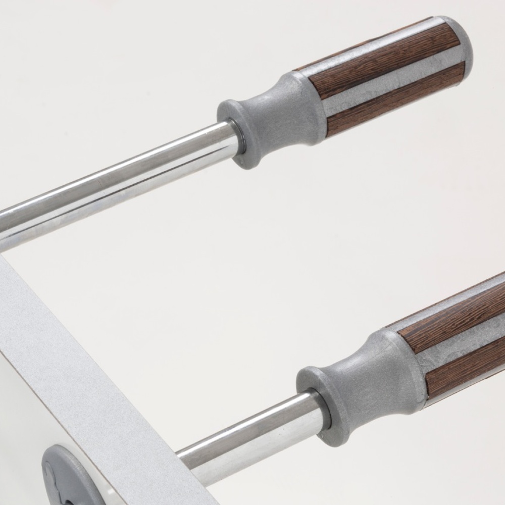 The table shares the same silver legs with levellers as the Evolution line by which it differs for the handles in silver plastic with inserts in wenge wood.