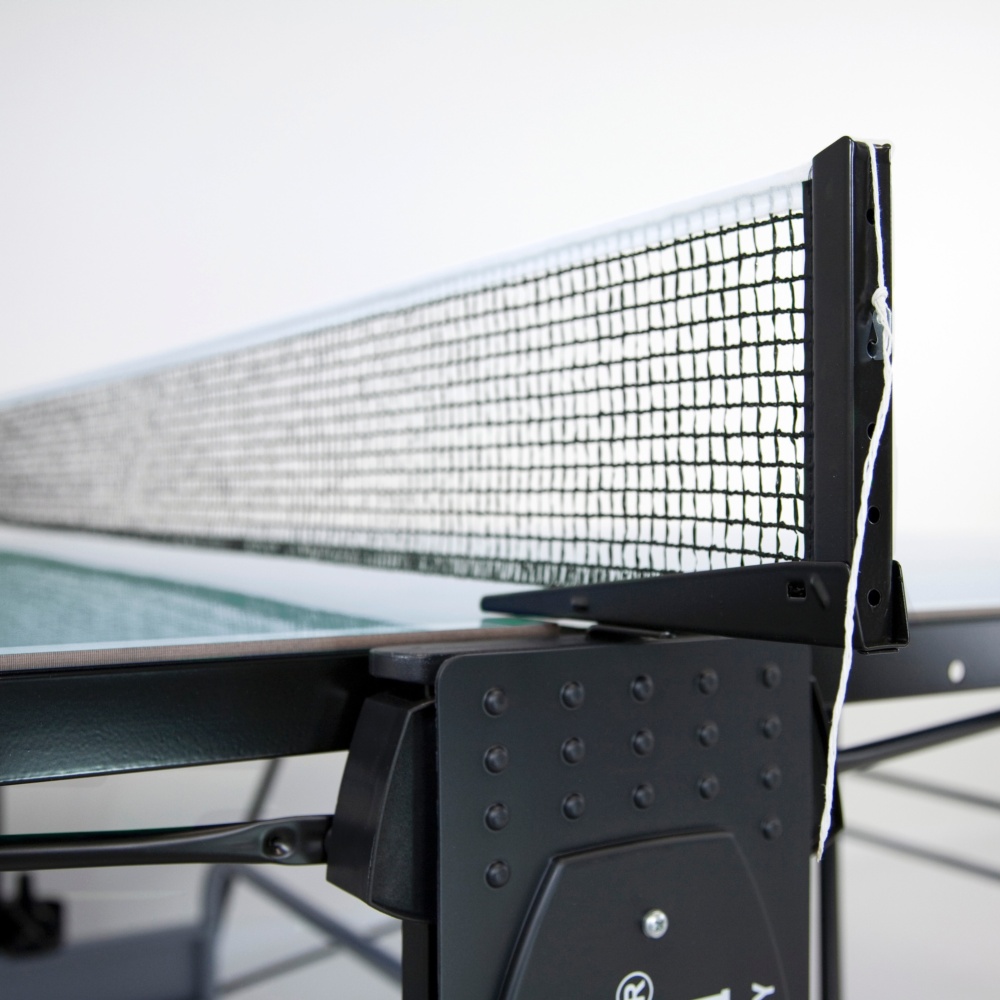 Indoor tennis table, foldable with automatic compact locking mechanism, available with green or blue top, official competition size, ideal for intensive leisure use and training.
