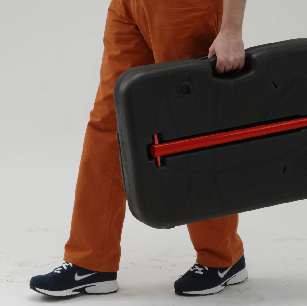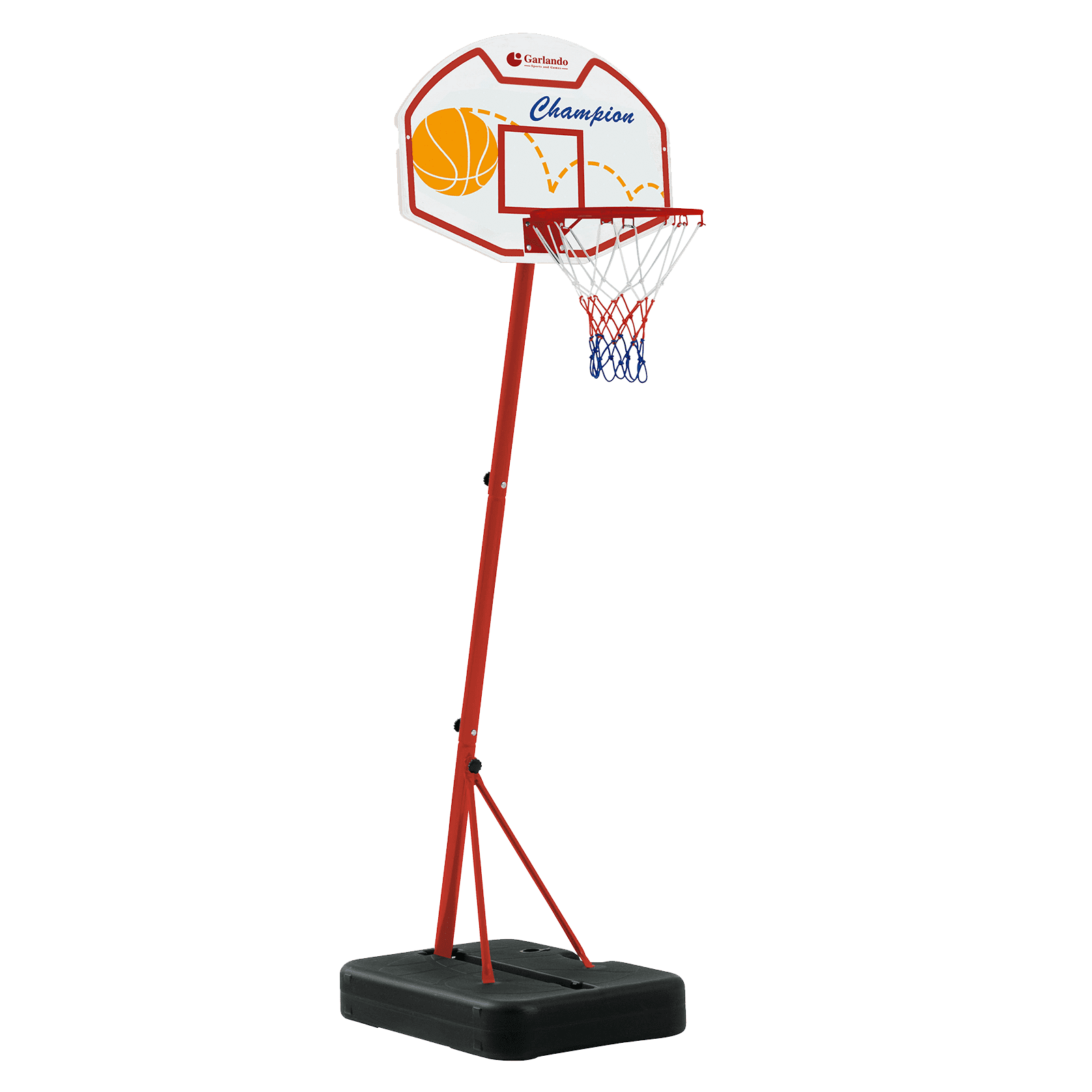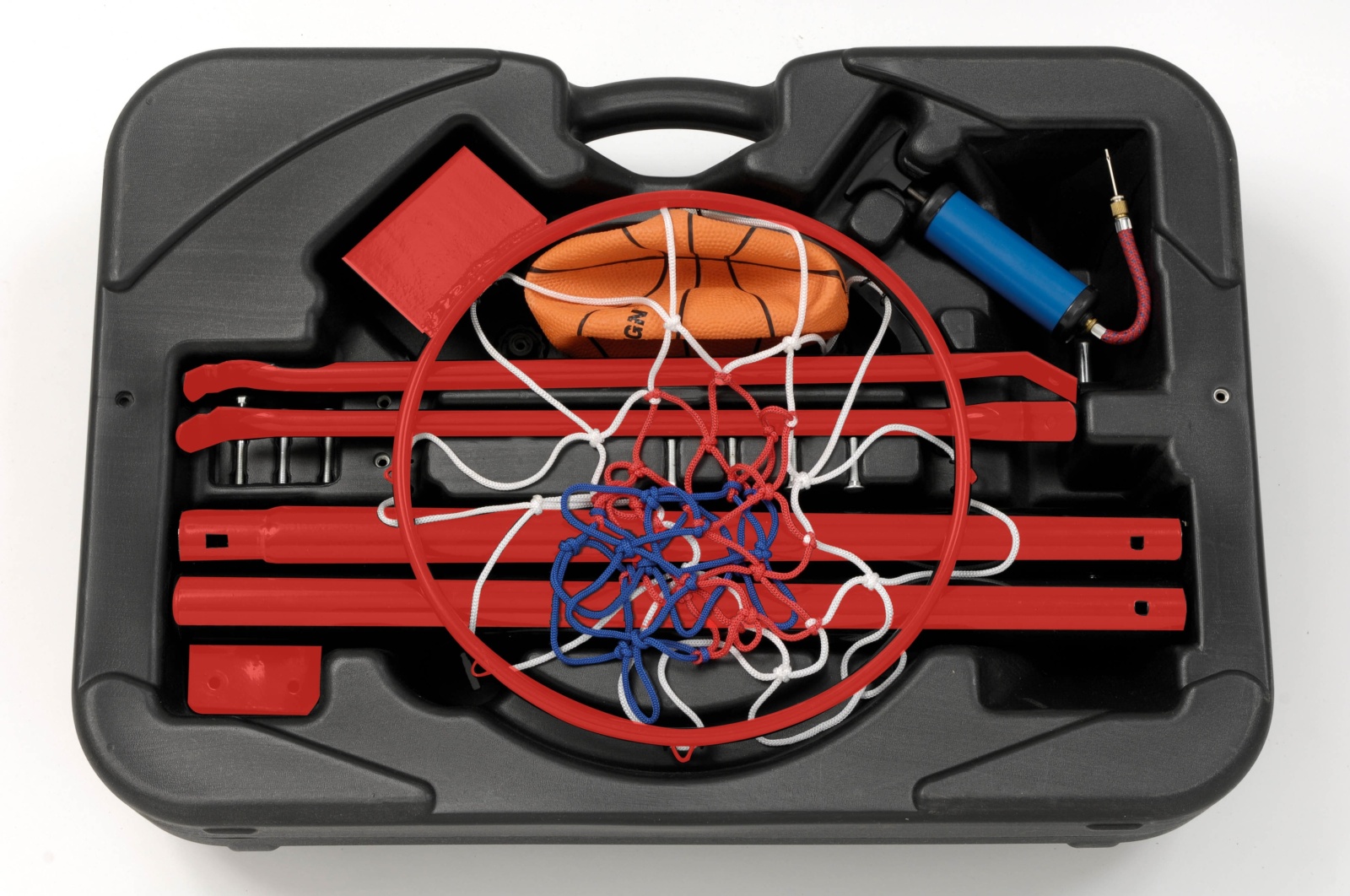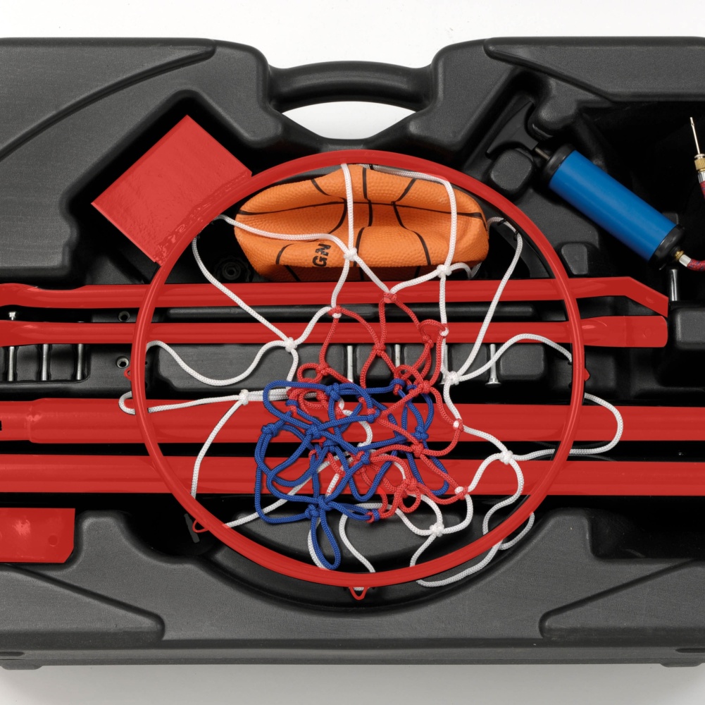 Pedestal in black moulded polyethylene, to be filled with water or sand to guarantee the stability while playing. The supplied kit is completed by one mini basket ball Ø16 cm and one hand pump to inflate it